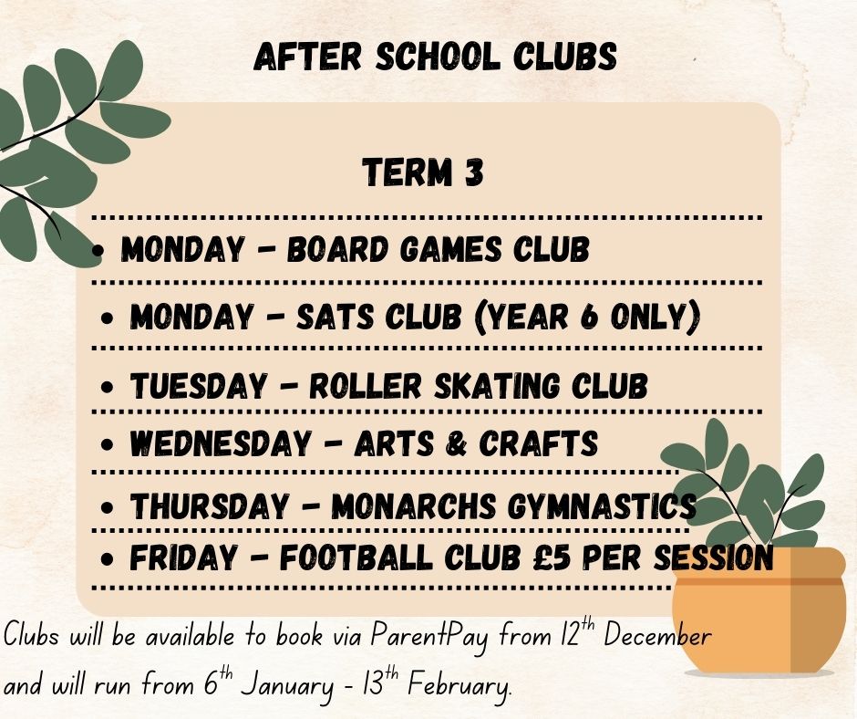 We have After School Clubs from 3.15pm till 4.15pm, Monday to Friday. Our clubs offer lots of different enriching activities. Clubs are £2.00 per session, unless managed by an outside provider. Booking and Payments are completed via Weduc ParentPay. Please speak to the School Office for more information.